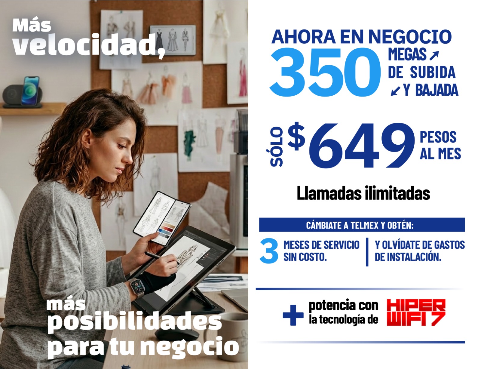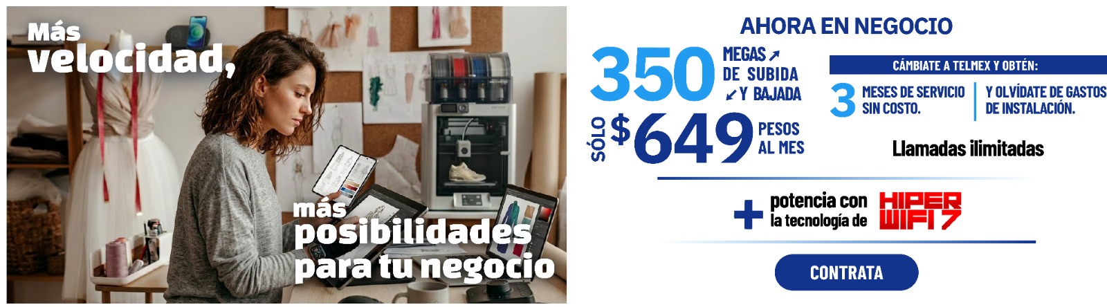 Precios con impuestos incluidos. La renta incluye llamadas ilimitadas a números fijos y móviles en México, Estados Unidos, Canadá y hasta 180 países más, consulta lista de destinos completa en telmex.com/destinosLDI Las velocidades comunicadas son en Megas (Megabits por segundo) y corresponden a la velocidad máxima de transferencia de datos ofrecida y alcanzable, la velocidad de bajada y subida podrá variar en función de las condiciones técnicas del módem, cantidad de dispositivos conectados simultáneamente y/o la distancia entre el domicilio del usuario y la central. A partir del 7o mes el cliente continuará con la velocidad de su paquete originalmente contratado. La velocidad aplica para usuarios activos sin adeudos en sus servicios de telecomunicaciones y nuevos que cuentan con fibra óptica instalada.Promoción de 100% de descuento en la renta de los meses 4, 8 y 12 (sobre servicio de telecomunicaciones) y promoción de descuento del 100% en gastos de instalación ($1,600 con impuestos), aplican para clientes que realizan el cambio de su servicio de telecomunicaciones a Telmex. Hiper Wifi 7 no está incluido. La oferta corresponde a un precio de contado de $2,799 o 12 mensualidades fijas de $239 por la adquisición de 2 equipos Mesh “HIPER WiFi 7” (incluye 2 equipos Mesh, 2 cables de red Ethernet y 2 adaptadores de corriente). Promoción aplicable a usuarios nuevos y existentes. CAT mensual del 4.7%. Consulta disponibilidad y compra en Centros de Atención Telmex y en telmex.com/tiendaenlinea Clientes No Infinitum, pueden verificar disponibilidad y precios en esta misma página. Los equipos serán entregados en el domicilio de tu Recibo Telmex. Plazos, condiciones, inscripciones IFT (ahora CRT) y velocidades promedio de descarga aplicables en telmex.com/terminosnegocio Vigencia al 31 de marzo de 2026.